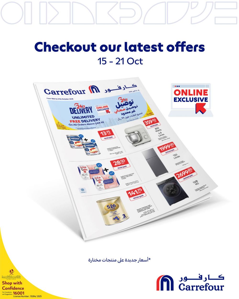 عرض حصري أونلاين! عروض كارفور وصلت مع منتجاتكم المفضلة! استمتعوا بأقوى العروض على الإلكترونيات والمزيد عند التسوق عبر الإنترنت www.carrefourqatar.com حتى ٢١ أكتوبر.