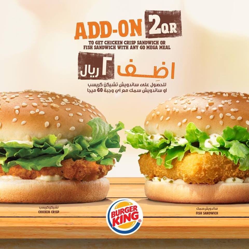 Burger King Qatar Offers Burger King Qatar surprises ADD ON 2 QAR To Get chicken crisp sandwich or fish sandwich with any GO MEGA meal